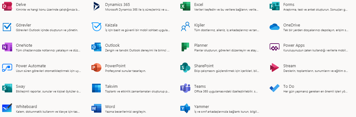 Oturum açtığınızda Office sizi bu ekrana yönlendirecektir. Premium planlarda sağladığı bazı özellikleri sağlamasa da birçok Office hizmetini ücretsiz olarak kullanabiliyorsunuz. Örneğin Premium planlardaki Outlook 365 hizmetini tamamen Premium şekilde kullanamıyorsunuz. Açtığınız web sitesine info@alanadı.com gibi bir e posta almak için genelde 10 GB kotası olan bir e postayı ücretsiz alabiliyorsunuz ancak Outlook 365 bu özelliği size sunabiliyor. Öğrenci e postasıyla alan adınızın e postalarını kontrol edebileceğiniz Outlook 365 hizmeti gibi birçok özelliği alamıyorsunuz ancak aşağıda gördüğünüz uygulamaların hepsini ücretsiz bir şekilde kullanabiliyorsunuz.